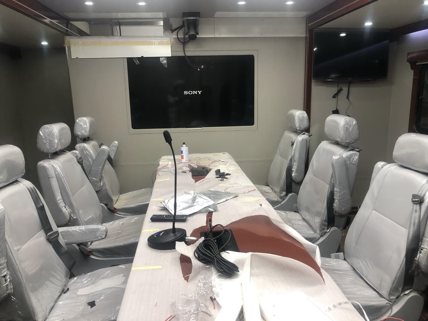 多功能應(yīng)急搶險(xiǎn)救援指揮車是采用東風(fēng)天錦、重汽豪沃、進(jìn)口奔馳等底盤上進(jìn)行改裝,能同時(shí)容納 7~10 人開會(huì),辦公。改裝后安裝了衛(wèi)星通信系統(tǒng);音視
